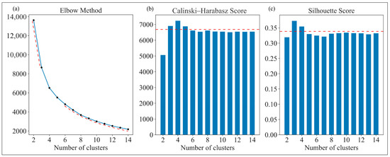 In order to utilize the FCM clustering algorithm effectively, determining the appropriate number of clusters for a given dataset is necessary. In the present study, the optimal clustering number was determined by comparing the results obtained from three distinct mathematical techniques: the Elbow method [61], the Caliński–Harabasz score [62], and the Silhouette score [63]. The Elbow method calculates the Within-Cluster Sum of Squares (WCSS), which is the sum of the squared distances between each point and the centroid within a cluster. The WCSS values are plotted on a graph against the number of clusters. The optimal number of clusters is identified at the point where the steep slope of the curve changes to a gentle slope, forming a characteristic ‘elbow shape’. The Caliński–Harabasz score, also known as the variance ratio criterion, assesses the dispersion of data points within their respective cluster and their separation from other clusters. It is calculated as the ratio between the sum of intracluster variance and the sum of the intercluster variance. A higher Caliński–Harabasz score indicates well-defined clusters within the data. The Silhouette index measures the closeness of each data point to its own cluster compared to the other clusters. It ranges from −1 to +1, where scores closer to +1 indicate well-defined clusters within the dataset, and scores close to −1 indicate incorrect clustering. By considering the results from these three techniques, the optimal number of clusters can be determined, ensuring the best representation of the underlying patterns in the data.