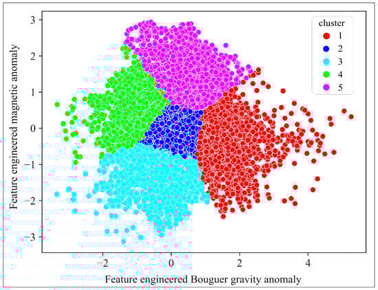 The 2D cross-plot illustrates the clusters of the feature-engineered Bouguer gravity and magnetic anomalies obtained from the Fuzzy C-Means clustering algorithm.