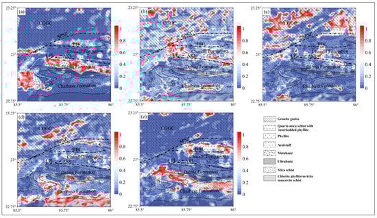 On a broad scale, the five clusters obtained using FCM analysis of Bouguer gravity and aeromagnetic anomalies demonstrate a significant correlation with the major geological formations in the study area, suggesting that FCM can be a useful tool for initial geological mapping. To quantitatively relate the geophysical signatures of each cluster with pre-existing surface geology, the fuzzy membership scores were determined for each data point in every cluster (Figure 11). A fuzzy membership score higher than 0.8 was considered a reliable indicator for assigning the geological attributes to the cluster responses of geophysical data. For cluster 1, fuzzy membership scores > 0.8 were found for the metabasic rocks of the Dalma Formation (Figure 11a). It is worth noting that the trustworthiness responses (fuzzy score > 0.8) of cluster 2 appear to be scattered in nature, indicating a less clear association with a specific geological formation (Figure 11b). The high fuzzy membership scores (>0.8) of clusters 3 and 4 correspond to the granite gneiss rocks of the CGGC (Figure 11c,d). Additionally, the high fuzzy membership scores (>0.8) of cluster 4 are linked to the mica schist and CP/SMS rocks of the Chaibasa Formation (Figure 11d). The mica-schist rocks of the Chaibasa Formation and QMSIP rocks of the Chandil Formation exhibit a trustworthiness value (>0.8 fuzzy scores) in cluster 5 (Figure 11e).