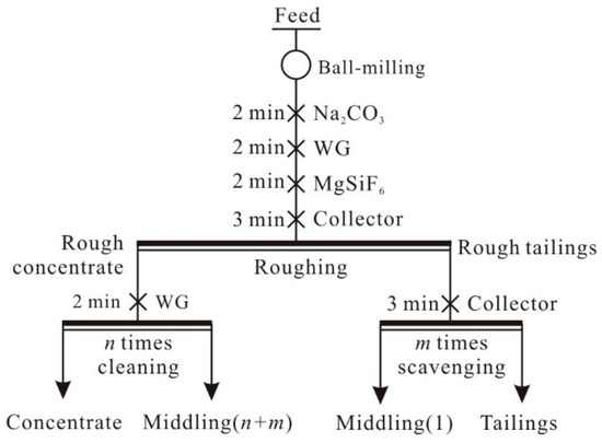 The flotation was performed with one stage of roughing, one stage of scavenging, and multiple stages of cleaning. The HIMS concentrate was ground to a particle size of 90% < 38 μm as feed; the pulp temperature and pH were 40 °C and 8.6 ± 0.2, respectively; the flotation mass concentration was 30%; the dosages of regulator (Na2CO3), inhibitor (WG), and activator (MgSiF6) in roughing were 1 kg/t, 1800 g/t, and 300 g/t, respectively. The dosages of each collector in roughing and scavenging were 400 g/t and 200 g/t, respectively. The rough concentrate was further cleaned several times without any reagents. Figure 1 shows the tests process and stirring time for each part. The pulp pH was adjusted using NaOH and H2SO4 solutions in this study.
