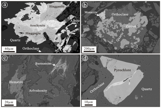 SEM images of RE minerals, hingganite, monazite, bastnaesite, aeschynite, and pyrochlore. (a) hingganite associated with quartz surrounds albite and interspersed with aeschynite; (b) monazite closely associated with orthoclase and quartz containing zircon; (c) bastnaesite and hematite distributing near amphibole; (d) pyrochlore surrounded by quartz and orthoclase.