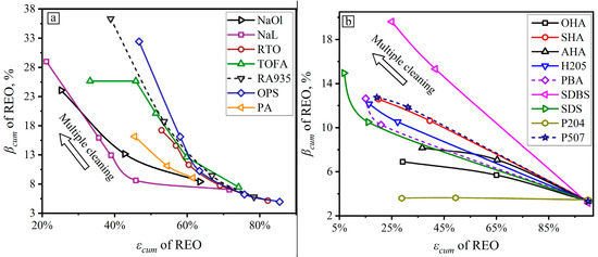 Figure 6 shows the relationships between the cumulative REO grade and recovery of flotation RE concentrates for different single collectors.
