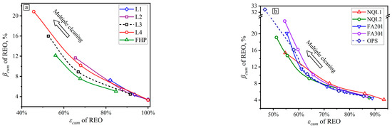 Relationship between the cumulative REO grade and recovery of flotation concentrates for different composite collectors. (a) L and FHP series collectors; (b) NQ, FA series collectors and OPS collector.