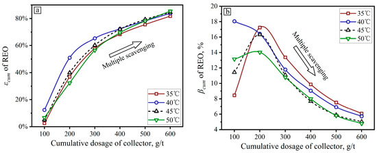Figure 8 shows that at a given temperature, as the amount of collector increased, the cumulative REO recovery in the concentrate increased, and REO grade gradually decreased. In other words, the possibility of RE minerals floating increased at lower collector contents. With the increase in the collector consumption, increasing amounts of RE minerals were collected and enriched in the concentrate products. Moreover, as the excess collector combined with gangue minerals, more gangue minerals began to float and enter the concentrate, and disordered floating intensified. When the collector dosage increased to 400 g/t, the rate of increase in the cumulative REO recovery in the concentrate decreased. Therefore, the value of 400 g/t was considered appropriate for the roughing stage.