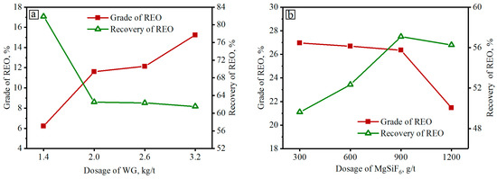 REO recovery and grade of the flotation concentrate at different dosages of WG (a) and MgSiF6 (b).