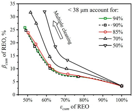 The previous mineralogy analysis results showed that RE minerals were closely associated with gangue minerals, so it is important to choose the appropriate grinding size to achieve liberation. Figure 10 shows the relationship between the REO grade and cumulative recovery of the flotation concentrate at different grinding sizes.
