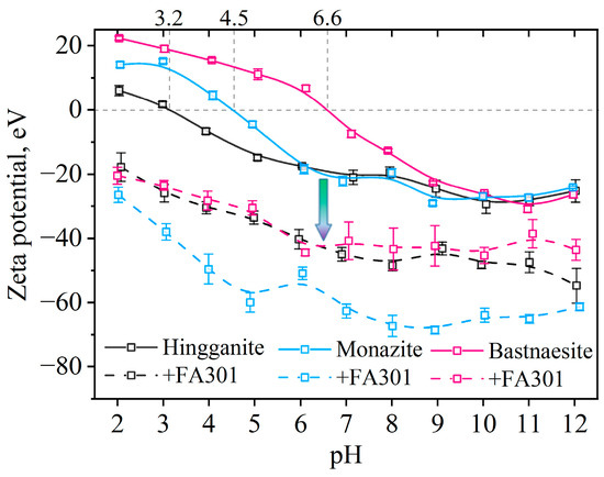 Zeta potentials were evaluated as a function of pH for each RE mineral (hingganite, monazite, and bastnaesite) treated with KCl solution (1 mM) in the absence and presence of FA301. The results are shown in Figure 11.