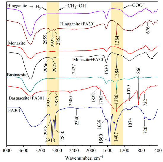 FTIR analyses were performed to clarify the substance structure of the collector on the mineral surface. Specifically, the infrared spectral characteristics of the collector adsorbed onto hingganite, monazite, and bastnaesite were investigated, as shown in Figure 13.