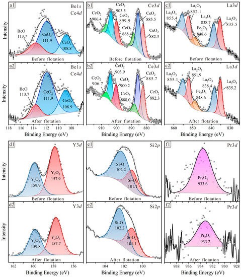 XPS characteristics of hingganite surface elements before and after flotation. (a) Be1s and Ce4d; (b) Ce3d; (c) La3d; (d) Y3d; (e) Si2p; (f) Pr3d.