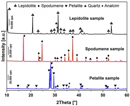 In addition, PXRD measurements (Figure 1) on the source materials yielded rather pure mineral samples of lepidolite (PDF#98-003-0784), spodumene (PDF#98-028-0109), and petalite (PDF#98-010-0348) with only minor natural cogenetic phases such as α-quartz (PDF# 98-020-1354). Furthermore, traces of analcime (PDF#98-004-0451) were only detected in petalite samples as a natural impurity which is consistent with data in the literature [31].