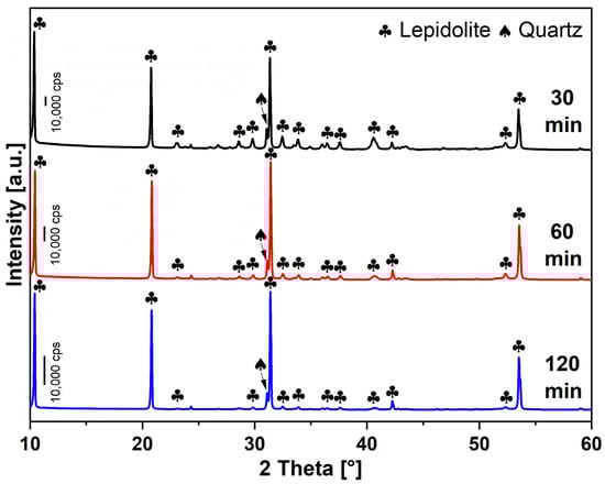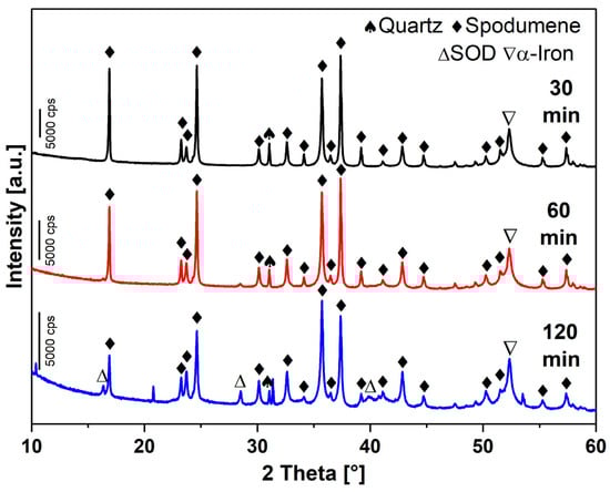 XRD measurements on leaching residues were chosen to evaluate the effects of mechanochemical treatment on the degradation of the lithium-containing phases in addition to ICP-OES analysis of the liquid samples. In the following (see Figure 3, Figure 4 and Figure 5), only the diffraction patterns of experiments at 7 mol/L are described since there were only subtle variations between the two investigated sodium hydroxide concentrations.