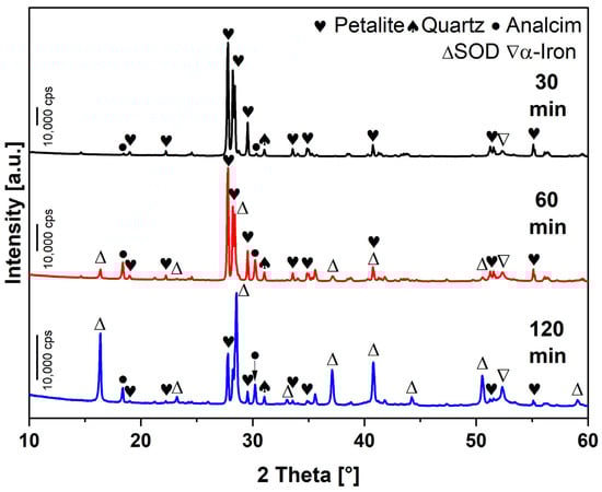 The results for the lepidolite samples shown in Figure 3 indicate no significant changes in phase composition or the formation of new phases during ball milling experiments conducted for up to 120 min. Furthermore, similar results were obtained for spodumene samples milled for only 30 or 60 min (see Figure 4), with no significant change in the diffraction peaks monitored. In contrast, the mechanochemical treatment for 120 min led to less intense diffraction peaks of spodumene and the formation of hydrosodalite (SOD, PDF#98-003-6050), both of which can be interpreted as the first signs of a breakdown of the initial phase. Investigations on petalite samples (see Figure 5) showed the appearance of hydrosodalite diffraction peaks after 60 min of milling, which became significantly more intense as the reaction time increased to 120 min in parallel with petalite peaks that became considerably weaker. Accordingly, these results indicate progressive decomposition, restruction, and transformation of the parent petalite phase into a hydrosodalite zeolite while ball milling in alkaline media. These results are consistent with our previous work using glass ceramics as a lithium source, where SOD was the dominant zeolite phase along with zeolite N (LTN) using 7 or 9 mol/L NaOH [29]. On closer inspection, minor remnants of petalite were still present at 120 min, indicating that phase transformation was not yet completed. In addition, traces of quartz and analcime occurred in several diffraction patterns which can be attributed to inhomogeneities in the natural source material.