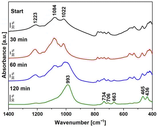 FTIR spectroscopy was selected to determine changes in molecular bonding of aluminum and silicon during alkaline treatment with 7 mol/L NaOH solution at constant milling parameters for different times. The resulting spectra shown in Figure 6 indicate a reorganization in molecular bonding after mechanochemical treatment. The first changes became visible in the range of 1000 cm−1 in the 60 min sample while the characteristic stretching vibrations of petalite at 1223, 1084, and 1022 cm−1 disappeared completely after 120 min, indicating a structural change. In this sample, SOD could be clearly identified by its typical Si–O–T (T = Al, Si) stretching and bending vibrations at 993, 734, 706, and 663 cm−1 in addition to the bending of oxygen bridges at 465 and 436 cm−1. In general, FTIR spectra obtained for petalite and hydrosodalite agree well with data in the literature and support the PXRD measurements, both of which indicate the decomposition of petalite and transformation into sodalite with progressive reaction times.