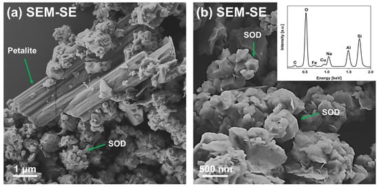 SEM-SE images of leaching residues obtained under optimal conditions show (a) an unreacted petalite fragment within hydrosodalite crystals and (b) intergrown isometric hydrosodalite crystals exhibiting a distinct dodecahedral habit, being mainly composed of Na, Al, Si, and O (SEM-EDS), while small Cu signals originate from sample coating.