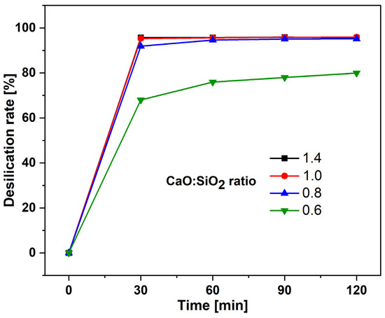 Desilication of the leaching solution as a function of different reaction time using different mass ratios of CaO:SiO2.