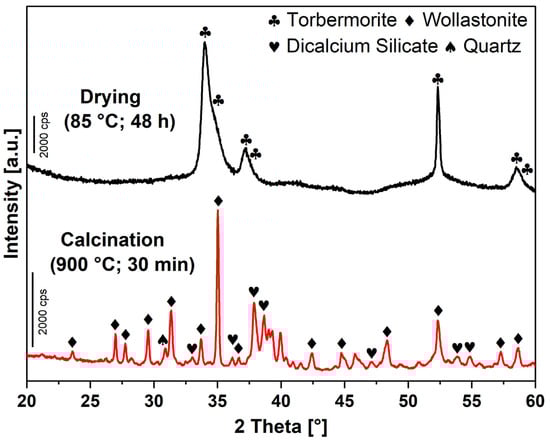 In terms of CaO consumption and removal efficiency, a CaO:SiO2 ratio of 0.8 is preferred, with 94.6% of the Si removed after a period of no more than 60 min while a slightly higher value of 95.1% was reached after 90 min time. In addition, ICP-OES measurements of the solution after desilication revealed elemental concentrations of Al (0.1 g/L), Li (2.7 g/L), and Si (1.9 g/L), indicating constant lithium content, while significantly lower values were obtained for Al and especially Si. In addition to analysis of the solution, PXRD studies of the precipitates (see Figure 9) revealed torbermorite (Ca5Si6O16(OH)2·4H2O; PDF#98-008-7690) as the main phase after desilication, which forms according to Equation (4) and transforms into wollastonite (Ca[SiO3]; PDF#98-020-1537) following Equation (5) when calcined at 900 °C for at least 30 min. Wollastonite, in particular, is an advantageous by-product since it offers numerous technical applications due to its high melting point and fibrous to acicular structure, thus providing an additional benefit for the entire route [34].