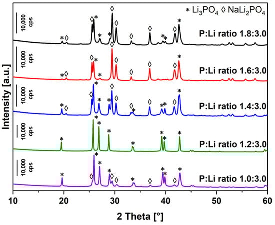 However, at higher P:Li ratios, mixed phosphates with orthorhombic nalipoite structure (Li2NaPO4) were formed in addition to Li3PO4, as confirmed by PXRD (see Figure 10). Since the purity of the precipitate is of great importance for further applications, a P:Li ratio of 1.2:3.0 is clearly preferred despite the comparatively low recovery of 72.9%, since here, pure Li3PO4 was detected in the corresponding diffraction patterns.