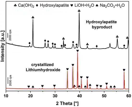 PXRD patterns of hydroxylapatite by-product and lithium hydroxide obtained after complete crystallization of the solution.