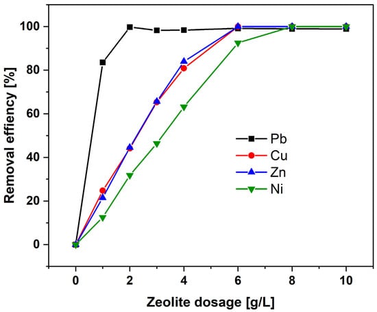 Adsorption experiments on synthetic wastewater samples containing heavy metal ions were adopted to investigate the sorption behavior of the synthesized zeolite by-product. Therefore, a removal efficiency was calculated for each experiment based on ICP-OES results and plotted in Figure 12 as a function of zeolite dosage.