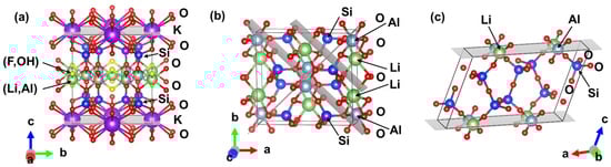 Idealized crystal structures on the unite cell level of the investigated minerals (a) lepidolite, (b) spodumene, and (c) petalite. The grayish colored areas indicate the most important cleavage planes within the structures while the orientation of the unit cell is given next to each structure. Notably, the figures were created using VESTA 3 employing atomic radii [41].
