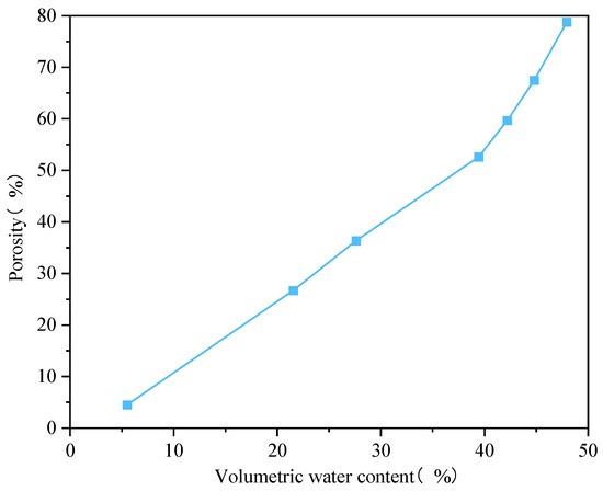 The evolution law of ore sample porosity under seepage was obtained through NMR technology. In this experiment, only the process from non-saturation to saturation of the ore sample was tested. Gao et al. [26] found that the porosity did not change during the saturation process when the ore was leached with clean water. Thus, the test was not conducted after saturation. In parallel experiments, ore samples are placed into the NMR instrument to detect the pore structure of ore samples with different volumetric water contents. Through the NMR instrument, the porosity variation rules of ore samples under different water contents can be obtained; the measured data are shown in Figure 5. It can be seen from the figure, during the process of converting the ore sample from non-saturation to saturation, the porosity of the ore sample shows a linear increasing trend with the increase in volumetric water content. The porosity of saturated ore samples after seepage has increased 17.5 times compared to the porosity of unsaturated ore samples before seepage. Due to the relatively small size of the ore sample and the need to measure a certain amount of matrix suction in an unsaturated state, a column leaching method with low water pressure and a low flow rate is required. Hu et al. [27] also pointed out that for ionic RE leaching, it is necessary to use a "small water pressure" injection method as much as possible, which can prevent the occurrence of pore clogging and increase the permeability of the ore body. From the envelope area of the later T2 spectrum curve, it can also be determined that the porosity will have such a change rule.
