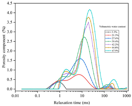 Variation of T2 distribution curves for different volumetric water contents of the ore sample.