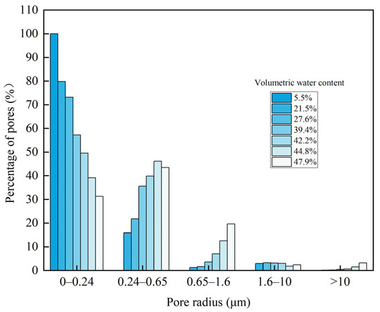 The pore radius is the maximum radius of the sphere that can pass through the pore throat; the unit is micrometer (μm). The size and proportional distribution of the pore radius are closely related to the pore structure. The larger the pore radius, the better the connectivity of the pore space. The percentage of pore radius of different sizes in total pores reflects the distribution of pore radius with different volumetric water contents. According to the range of pore size measurement values, pore size is divided into five categories: A pore size range of 0–0.24 μm is called a micro-pore; a pore size range of 0.24–0.65 μm is called a small pore; a pore size range of 0.65–1.6 μm is called a medium pore; a pore size range of 1.6–10 μm is called a large pore; and a pore size greater than 10 μm is called a mega pore. The distribution of different pore sizes is calculated by the T2 distribution curve, as shown in Figure 7. In this way, the dynamic changes of the pore radius in the internal structure of the pore can reflect the evolution of the pore structure of the ore sample under the action of solution percolation. During the leaching process, the pore structure of the ore sample is constantly undergoing dynamic changes due to the action of the seepage field. When clean water is used as the leaching solution, as the volumetric water content of the ore sample increases, the porosity of the ore sample gradually increases, micropores gradually disappear, and small, medium, large, and mega-large pores gradually form and show an increasing trend.
