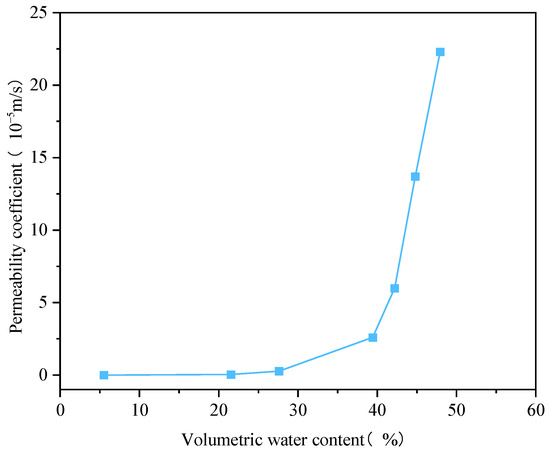 The permeability coefficient for different volumetric water contents was calculated by using the T2 (SDR) model, as shown in Figure 8. Research has found that the distribution of pore radius is an important factor affecting the change in permeability coefficient of weathering crust leaching type RE ore [31]. During the process of the ore sample from non-saturation to saturation under seepage, the permeability coefficient increases almost very little when the volumetric water content is less than 22%. At this time, the pore structure is still dominated by micropores, and when the volumetric water content is greater than 22%, the permeability coefficient increases. At this time, some large, medium, and small pores have already been generated, and it shows an increasing trend, which can be explained by the fact that when the proportion of small pores is high, the bound water film formed on the surface of RE ore particles occupies the effective pores and greatly hinders the permeability of the leaching solution. However, when the proportion of large, medium, and small pores is high, the bound water film effect is weakened and the seepage effect of the leaching solution in the ore body is significantly enhanced. Based on the above research analysis, in the distribution of pore radius, the more large and medium pores, the greater the permeability coefficient, and the more micro and small pores, the smaller the permeability coefficient. However, the reduced effective percolation pore size is not recoverable due to particle migration, which makes it impossible to restore the permeability of the ore sample to its original level. Zhou et al. [32] found that the ion exchange process hinders the permeation of the leaching solution. Therefore, through the analysis of the above study, in order to ensure the leaching effect, the ore body with poor initial permeability should be leached with low water pressure and clear water first and then with leaching solution, which can prevent the phenomenon of pore blockage and improve the permeability of the ore body, effectively improve the efficiency of RE leaching, and save materials, which is also very considerable in terms of economic benefits.