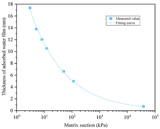 The water film on the surface of soil particles in the mineral layer includes bound water and free water caused by capillary action and matrix suction [33]. When assuming that the pores of the soil are capillaries, the water film layer adhered to the surface of soil particles and between particles will change under the dominant effect of matrix suction, and the thickness of this adsorbed water film can be calculated by the Halsey equation [34]. The calculation results are shown in Figure 9. As can be seen from the figure, the thickness of the adsorbed water film on the surface of the rare earth particles shows a power function decreasing trend with the increase of the matrix suction. It can be interpreted as assuming that one mol of water is unfolded to a single molecular thickness and covers the entire solid surface; the smaller the volumetric water content at this time, the greater the matrix suction, and the smaller the thickness of this adsorbed water film will be.