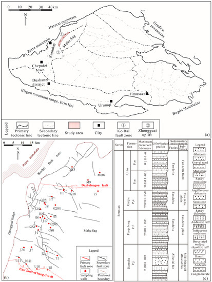 Geological setting of the western periphery of the Mahu Sag, Junggar Basin. (a) Location map of the study area; (b) well locations and structural features; and (c) stratigraphic log. In (a), the term “primary structural lines” and “secondary structural lines”, respectively, refer to the boundaries of primary structural units and secondary structural units within a basin.