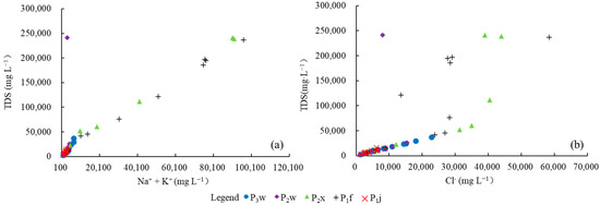 Relationship between TDS concentrations and (Na+ + K+) and Cl− concentrations. P3w: Upper Urho formation; P2w: Lower Urho formation; P2x: Xiazijie formation; P1f: Fengcheng formation; P1j: Jiamuhe formation.