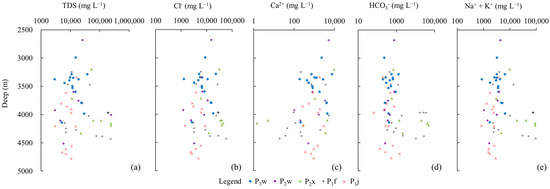 Variations in the chemical characteristics of oilfield water with depth for (a) TDS; (b) Cl−; (c) Ca2+; (d) HCO3−; and (e) (Na+ + K+).