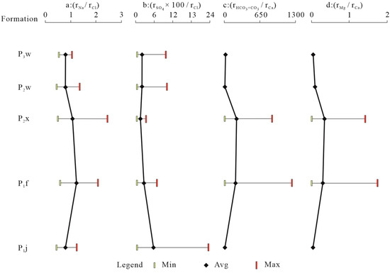 In relation to interactions between oilfield water and hydrocarbons that consume sulfate, the rSO4 × 100/rCl ratio provides a measure of the consumption of sulfate and is an indicator of oilfield water redox conditions. With high sulfate removal, the ratio is near zero, indicating better sealing, a reducing environment, active water–rock interaction, and good hydrocarbon preservation conditions [32]. The values for Permian oilfield water of the present study ranges between zero and 23.55 with an average of 2.93, indicating that the reservoir has suitable sealing properties and relatively intense reduction, which are beneficial to oil and gas preservation. However, the ratio varies markedly between formations. Ranges (averages) for the different formations are as follows: Upper Urho Formation, 0.04–9.23 (2.0); Lower Urho Formation, 0–9.28 (1.94); Xiazijie Formation, 0.08–3.56 (1.46); Fengcheng Formation, 0.13–7.64 (2.60); and Jiamuhe Formation, 0.27–23.55 (5.74) (Figure 4b).