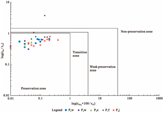 The relationship between rNa/rCl and rSO4 × 100/rCl for oilfield water can be used to divide the preservation environment into transition, preservation, non-preservation, and weak preservation zones, which reflect the hydrocarbon preservation conditions [36]. The data of the Upper Urho, Lower Urho, Xiazijie, and Jiamuhe formations are mainly in the preservation zone. The Fengcheng Formation has two data points in the transition and non-preservation zones (Figure 5). This indicates that preservation conditions in the Upper Urho, Lower Urho, Xiazijie, and Jiamuhe formations are more favorable for hydrocarbon preservation than those of the Fengcheng Formation.