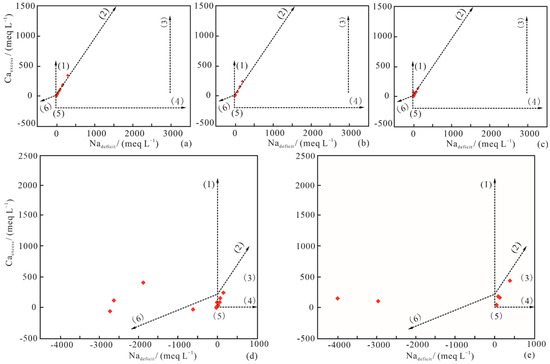 Nadeficit–Caexcess plots for the western periphery of the Mahu Sag, showing the dissolution of CaSO4 and dolomitization (1); exchange reactions between one Ca and two Na ions (2); a reaction mixture (3); ocean evaporation (4); saturated salt rock (5); and dissolution of salt rock (6). (a) Upper Urho Formation; (b) Lower Urho Formation; (c) Jiamuhe Formation; (d) Fengcheng Formation; (e) Xiazijie Formation.