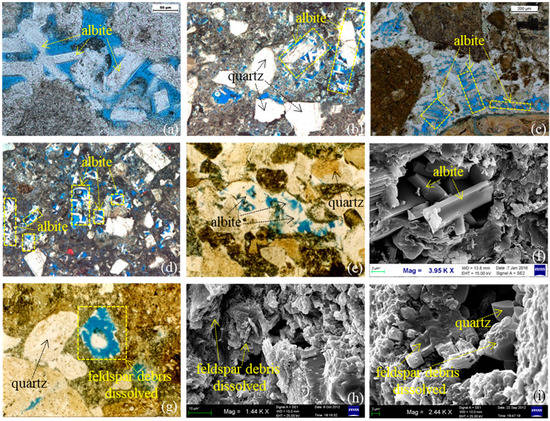 Microscopic characteristics of feldspar in the Permian reservoir of the western periphery of the Mahu Sag. (a) Well YT1, 4872.5 m, P2w; intergranular pores of sandy conglomerate are filled with authigenic albite; the albite crystal is intact with no dissolution; ×50. (b) Well JL31, 3149.41 m, P1j; matrix contains tuffaceous, intergranular pores; dissolution pores developed in the matrix; pores are filled with columnar authigenic albite; ×50. (c) Well YB4, 3870.11 m, P2w; euhedral columnar albite is developed in intergranular pores of sandy conglomerate; ×50. (d) Well JL31well, 3149.86 m, P1j; authigenic albite is developed in the matrix; dissolution pores are rich in tuffaceous sandstone; albite formed after the dissolution; ×50. (e) Well K80, 4156.77 m, P2w; residual intergranular pores of sandstone are filled with authigenic albite minerals and intercrystalline pores are developed; ×80. (f) Well YB4, 3915.31 m, P2w; columnar albite has grown in intergranular dissolution pores; minerals have well-developed crystal forms without dissolution; ×3950 (SEM). (g) Well K80, 4155.23 m, P2w; feldspar particles in sandstone are dissolved to form moldic pores and intragranular dissolution pores (intra-feldspar pores); ×80. (h) Well J206, 4012.62 m, P3w; feldspar particles are strongly corroded, producing a large number of dissolution pores in the particles; ×1440 (SEM). (i) Well JL8 well, 3290.35 m, P3w; clastic feldspar particles have undergone strong dissolution, and authigenic quartz has grown in the intergranular dissolution pores; ×2440 (SEM).