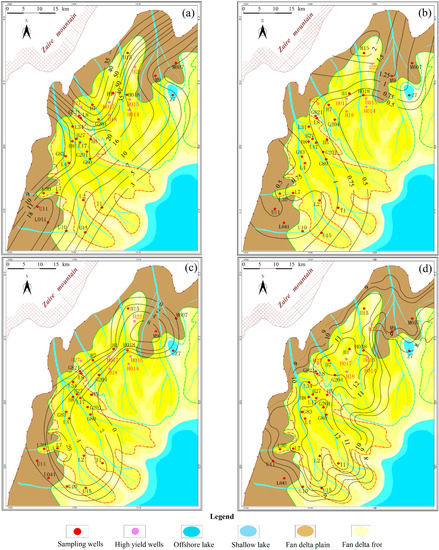 Distribution maps (Figure 9) of TDS concentration, and rNa/rCl and rSO4 × 100/rCl ratios of the Upper Urho Formation were prepared to indicate the association between the chemical characteristics of oilfield water and areas suitable for exploration. The average porosity distribution of the Upper Urho Formation was used to discuss the relationship between the chemical characteristics of oilfield water and porosity. The influence of the sedimentary environment was also considered through source direction and facies distribution.