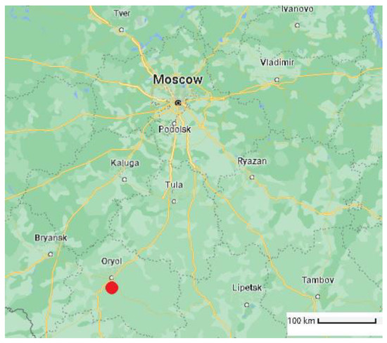 Pyrite spherical nodules and pyritized wood were collected for the study from a sand quarry near the village Sukhochevo, Kromy district, Oryol region (Figure 2), Russia. The geological age of the finds is Middle Jurassic, Middle Callovian. The age was determined by the accompanying fauna [39]. The inner core of the gastropod mollusk Bellerophon sp. shell, collected in the deposits of the Middle Carboniferous, Moscovian Stage, Myachkovo Horizon, in the Domodedovo quarry (Russia, Moscow Region) was measured for comparison.