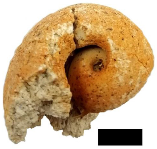 The inner core external view of the gastropod mollusk Bellerophon sp. shell composed of limestone. Scale bar is 1 cm.