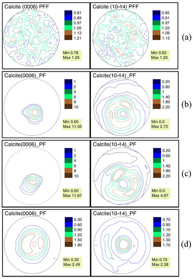 Calcite pole figures (a) of the inner core of the gastropod Bellerophon sp. shell; calcite pole figures of recent bivalve mollusks Mytilus galloprovincialis: (b) coast of the Kazantip Bay (Sea of Azov, Crimea Peninsula) opposite the village Pesochnoe, (c) Black Sea, coast of Romania; (d) calcite pole figures of the recent bivalve Ostea edulis, coast of Portugal, Lagos.