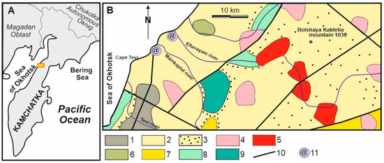 (A) Location of the studied area. (B) Simplified geological map of the Tevinskoe agate deposit area based on [22,23,24,25]. Legend: Quaternary glacial sediments: 1—unlayered blocky-pebble-boulder loams and sandy loams, clays with gruss, crushed stone and boulders clays. Eocene–Oligocene subvolcanics rocks: 2—andesitobasalts; 3—dacites; 4—basalts. Middle–Upper Eocene: 5—amphibole–biotite dacites and rhyolites, two-pyroxene andesites and basalts; 6—vitroclastic tuffs and tuffites with mineral and brown coals, coaly tuff-siltstones; 7—dacites, rhyolites, andesites, their tuffs, ignimbrite and tuffites. Cretaceous–Paleogene: 8—sandstones and siltstones with interbeds and lenses of coaly argillites, concretions of carbonate sandstones and marls. Upper Cretaceous: 9—argillites, sandstones, siltstones, siliceous rocks; 10—faults; 11—sampling agate placers of the Tevinskoye deposit.