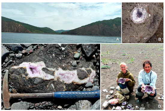 Field outcrop photographs illustrating the Tevinskoye agate deposit in the Eocene volcanic rocks within the Kinkilsk complex of Northern Kamchatka. (A) View of coastal outcrops of volcanics with agate placers in the bay; (B) rounded agate amygdule with amethyst in the amygdaloidal basalt (size 9 cm × 10 cm); (C) lens-shaped agates with amethyst infill cavities in the agglomerate tuff; (D) examples of collected agate samples with amethysts.