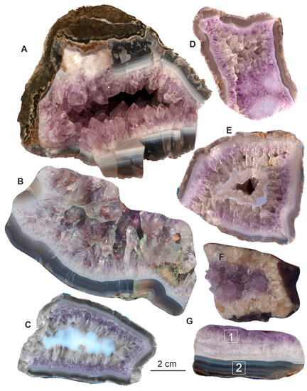 Agate amygdales and geodes with amethyst exhibit rounded or lens-like shapes (Figure 2B,C). The mean size of the agates ranges from 3 to 12 cm, and large samples with a size of up to 30 cm occur rarely (Figure 2D). Agates mostly display monocentric concentrically zoned (Figure 3A,E,C). The outer parts of agates are characterized by a fine-banding texture and they display alternate light-gray and white-colored layers, with thickness varying from 0.5 mm to 1 cm (Figure 3A,B,G). The banded area is followed to the inside of the geode by quartz crystals. Amethyst crystals with sizes of up to 3 cm along c-axis encrusted central agate cavities as overgrowth on colorless and milky-white quartz (Figure 3A,B). The violet amethyst color commonly increases in quartz crystals towards the agate center. Sometimes amethyst can compose the individual intermediate layer between outer banded and internal crystalline agate zones (Figure 3C,E). In some agates, thick carbonate (calcite) layers form the outer zone (Figure 3F). The marginal rim of the agates at the point of contact with the host rock often comprises zeolite crystals.