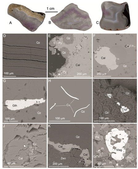 Photographs of the SEM-EDS-examined polished agate sections (A–C) and BSE images (D–L), illustrating mineral assemblages of agates with amethyst from the Tevinskoye deposit. (D) variations in porosity between chalcedony and macrocrystalline quartz (Qz) in outer agate zone; (E) Ni-rich pyrite (Py) inclusions accompanied by calcite (Cal) layer at the point of contact with host rock; (F) Mn-rich calcite aggregate, which is partially corroded by silica (arrows); (G) paniculate-shaped growth of needle-like goethite (Gth) crystals; (H) filamentous native copper (Cu) inclusion in quartz matrix; (I) grains of chalcopyrite (Ccp) surrounded by quartz; (J) grains of covellite (Cv) in calcite matrix; (K) prismatic crystals zeolite/clinoptilolite (Zeo) associated with calcite and quartz at the point of contact with host rock; and (L) main rock-forming minerals of the agate host volcanics: pyroxene (Prx), plagioclase (Pl), magnetite (Mag), and quartz. Images (D,I,K) correspond to agate sample identified by the X-ray diffraction (Section 4.3); images (E,F) correspond to sample from photo (A); image (G) corresponds to sample from photo (B); and images (H,J,L) correspond to sample from photo (C).