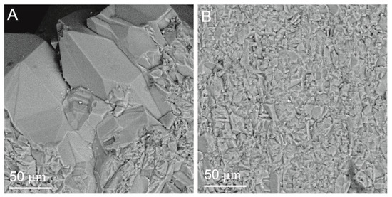 Additionally, SEM investigation of the surface morphology of the agate chips revealed the presence of different internal microstructures. Textures caused by well-shaped quartz crystals with sizes up to 150 µm (Figure 6A), as well as textures with an unclear granular surface (Figure 6B), are the most typical of the examined agate. The absence of a petrographically revealing fibrous texture of chalcedony is unexpected.