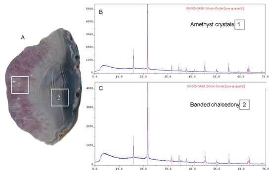 Photograph of agate with amethyst (A) and diffractograms corresponding to the amethyst crystals (B) and banded chalcedony (C) areas in the range of 5–75 °2θ. The samples areas selected for XRD analysis are marked squares on (A). The red lines on (B,C) point to peaks corresponding to alpha-quartz.