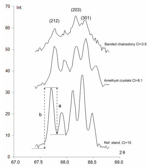 The relative intensities of reflection on the X-ray diffraction pattern are used for the calculation of a quartz crystallinity index value (CI). The CI of examined samples is defined, following the specifications of Murata and Norman [32], based on the peak resolution in the (212) reflection at 2θ 68° as CI = 10Fa/b, where the scaling factor F is 1.2 (Figure 8). A quartz crystal from the hydrothermal metamorphogenic veins of the Subpolar Urals (Russia) [33] served as a reference standard, with CI = 10. The diffractogram of amethyst crystals is characterized by well-developed 2θ reflections (212), (203), (301) and higher CI values (8.1) as compared to banded chalcedony, with a CI of 3.9 (Figure 8, Table 1).