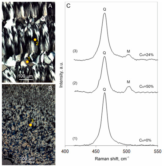 Micrographs (transmitted light mode with cross polars) and Raman spectra of local analyses of banded area composed of fibrous chalcedony and micrograined quartz (A), and microcrystalline quartz area (B) at the boundary with host rock. Raman spectra (1–3) on (C) correspond to analytical spots, which are marked by yellow circles on the photos. Spectrum (1) shows the main characteristic, i.e., symmetric stretching-bending vibrations of α-quartz (Q) at 465 cm−1, whereas spectra (2,3) show the peaks of α-quartz (Q) and moganite (M) at 502 cm−1. CM is moganite content.
