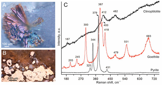 Local Raman spectroscopy analyses confirmed the presence of clinoptilolite phases in Tevi agates, which have been identified using their main Raman broad bands located at 412 and 478 cm−1 [34] (Figure 10C). Randomly distributed growths of needle-like crystals in agates (Figure 10A) were identified as goethite by their characteristic Raman bands at 166, 205, 245, 300, 387, 418, 479, 551 and 683 cm−1 (Figure 10C). Mineral inclusions occurring as clusters within the silica matrix were evidenced as pyrite by the presence of its marker bands at 344, 379 and 431 cm−1 [35] (Figure 10B,C). The small band at 325 cm−1 can arise from the marcasite admixture [35].