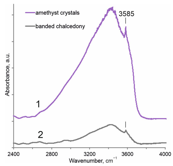 FT-IR spectroscopic investigation was applied to analyze water speciation of the two areas (banded and amethyst) of the Tevi agate sample, as shown in Figure 3G. The IR spectra on the principal water-stretching region (2800–3800 cm−1) in both cases are represented by an asymmetric broad absorption band near 3400 cm−1 and a shoulder near 3260 cm−1 (Figure 11). These bands are attributed to symmetric and asymmetric O–H stretching vibrations in water molecules. Molecular water in quartz and chalcedony can be contained in micropores and fluid inclusions [36,37]. The intensity of the 3400 cm−1 band is proportional to the content of molecular water. The IR spectrum of the amethyst area shows a much higher intensity of the water band in comparison with the banded area. Additionally, both spectra show a relatively sharp band at 3585 cm−1 on the background of a broad band. The assignment of this band is considered in the Discussion section.